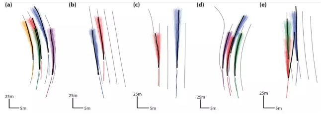 马萨诸塞州驾驶数据集的定性实验结果样例如上所示。每辆车的过去轨迹以不同的颜色显示,其后连接的是网络对这些车未来轨迹的预测的采样。正确结果(Ground Truth)的轨迹以黑色显示,车道中心以灰色显示。