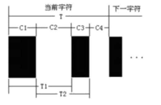 图中 C1,C2,C3,C4表示每个字符中四个相邻条、空的宽度, T 表示一个字符的宽度, T1,T2 表示相似边之间的距离,把其归一化后按表查询即可获得其编码值。