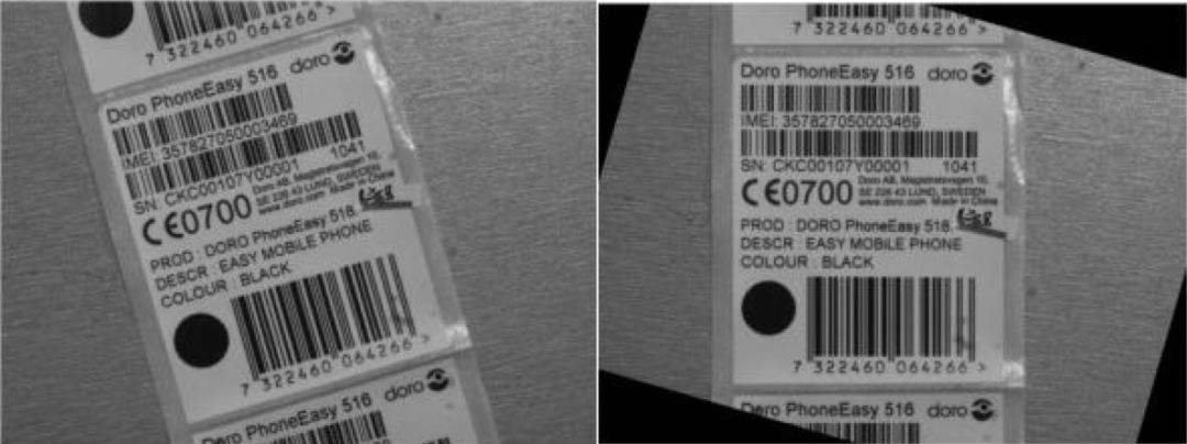 由于物体在传送带上的位置并不固定, 所以相机所采集到的条码图像中条码区域可能出现倾斜, 为便于后续的条码定位和分割提取必须要将倾斜的条码图像转正。