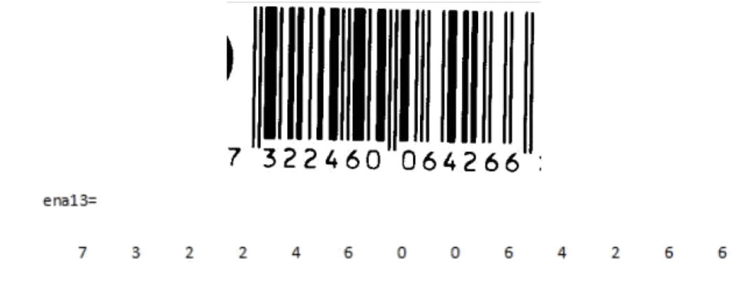 由 MATLAB 实现该方法,关键是要检测出相似边之间的距离。可从左到右对条码进行水平灰度扫描, 以灰度值跳变的点作为条和空的标记坐标,从而计算出由各个条、空的宽度,并通过计算 n=T/7,T=1C+2C+3C+4C 得到单位模块的宽度。各个条空的宽度除以单位模块的宽度就是归一化的条空宽度。而为了方便译码,我们除去起始符 3 个条空,中间分隔符 5 个条空,终止符3 个条空,对剩下的 48 个条空每 4 个条空为一组进行译码。计算相似边之间的距离t1、 t2 从而得到归一化( T1,T2)。最后查表可得条码字符。再根据译出的左侧6位数据符的奇偶性算出前置符。以下是译码效果: