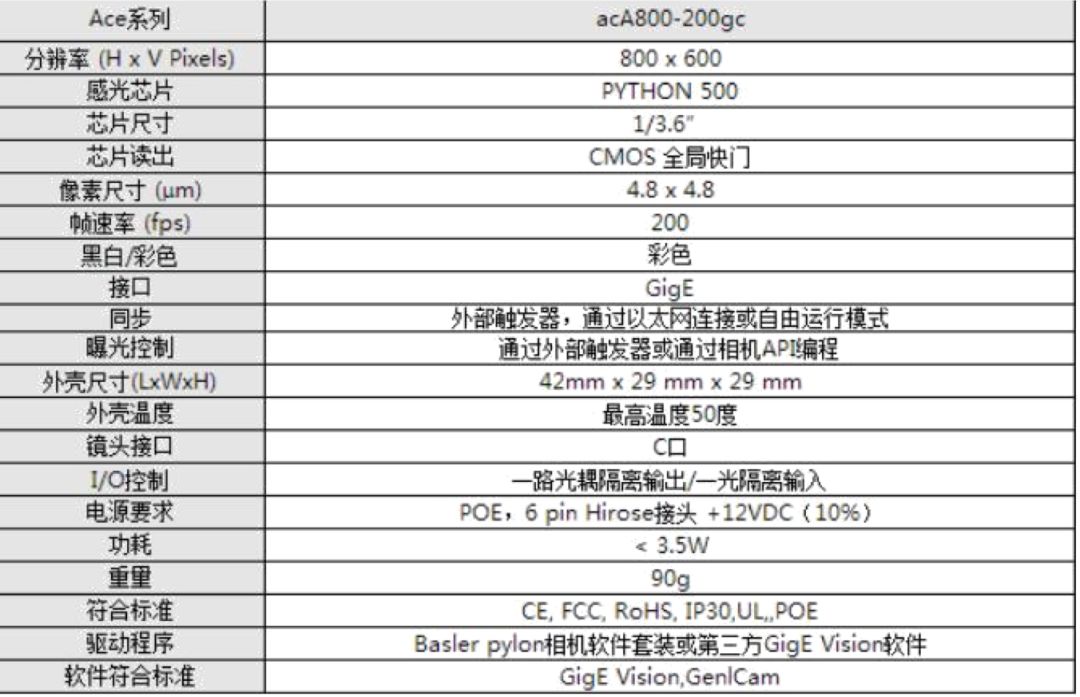 综合考虑,本方案选择采用 德国Basler 公司制造的 acA800-200gc/gm 型号工业相机,其参数如下: