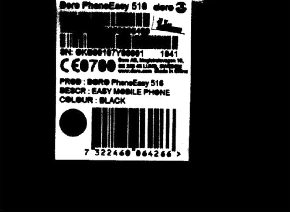 由于同一款手机产品,其条码的贴纸上的条码字符等信息的位置都是固定的,因此把图像中纸面部分分割出来后, 按固定位置的物理分割能很容易把条码部分分割出来。