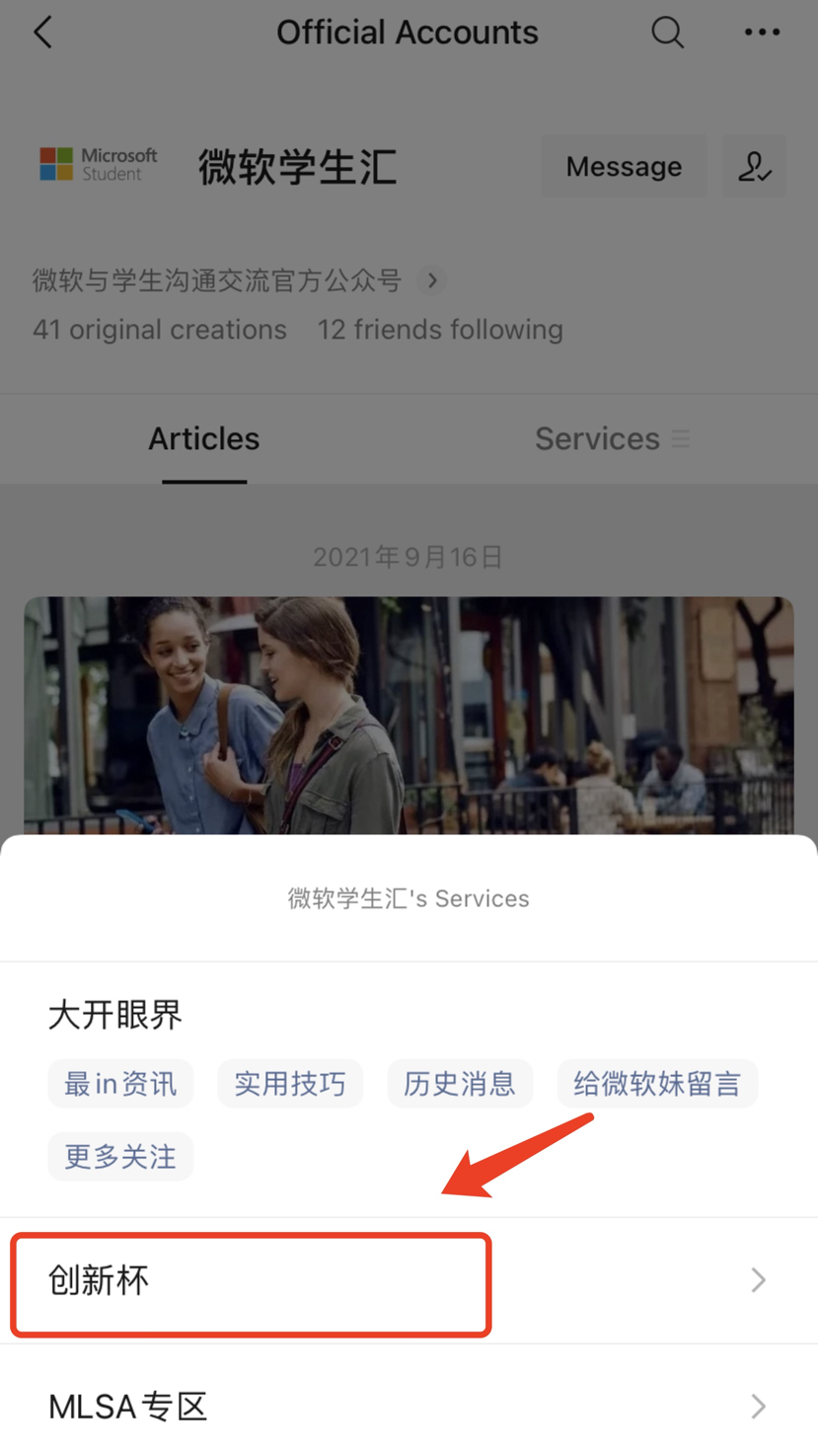 搜索并关注【微软学生汇】公众号,在菜单栏【创新杯】找到软妹,在那里我将会为大家回答关于微软“创新杯”的那些事儿,你不仅可以向我打字咨询,还可以语音咨询哦!