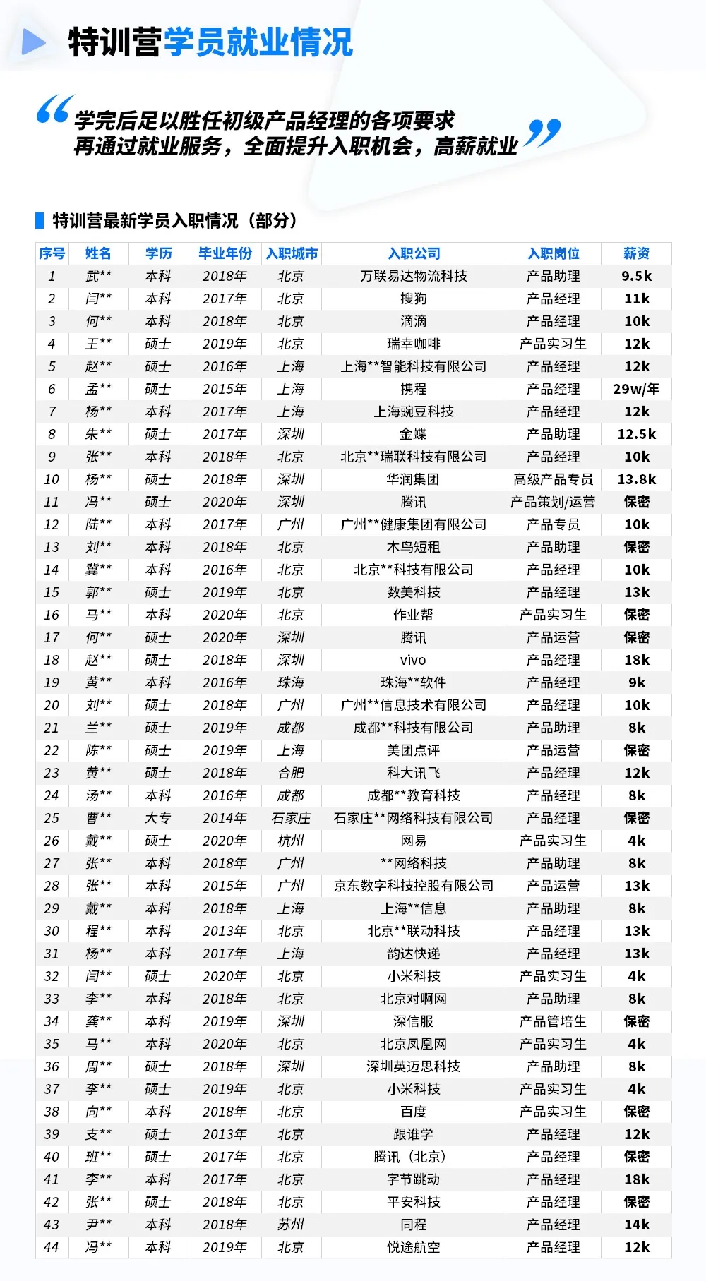 这么多应届生或职场新人能顺利拿到心仪的offer,是因为特训营提供了系统完整的产品经理从0到1的技能培训与求职就业服务。