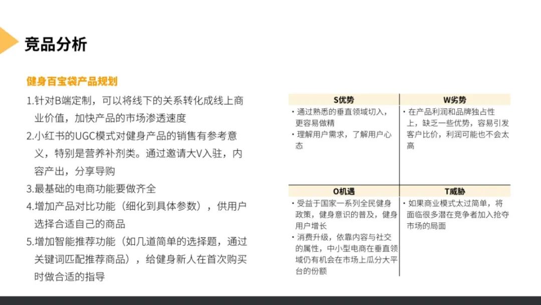 Arsene同学通过10周时间,不仅习得了产品经理的基础知识和技能,同时围绕着产品从0到1的过程:市场分析、竞品分析、用户分析、需求分析、功能设计、原型设计、版本规划等知识模块,产出了一份很优秀的毕业答辩PPT作为自己的求职作品。