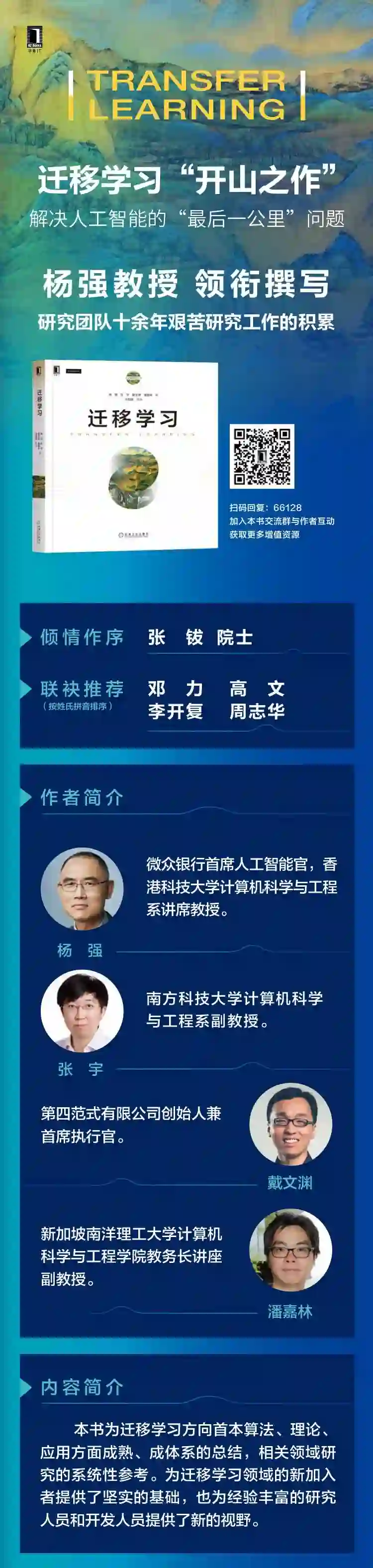 周末福利时间:本次联合【机械工业出版社华章公司】为大家带来杨强教授最新力著《迁移学习》,留言区谈谈你的迁移学习体会,截止8月19日周三晚22点,我们会从留言区选择3位认真留言的读者进行赠书(注意,不以点赞为依据,在其他公号已获赠此书者,重复参与活动无效)。