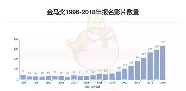 闻天祥所说的金马奖曲线变化,也正符合大陆电影产业发展现状。小娱整理了金马奖报名影片的数量增长变化图,发现它不仅和大陆电影入围金马奖的增长变化趋势相近,也和大陆电影产业发展现状息息相关。(注:因为合拍片居多,大陆电影定义为大陆导演的作品)
