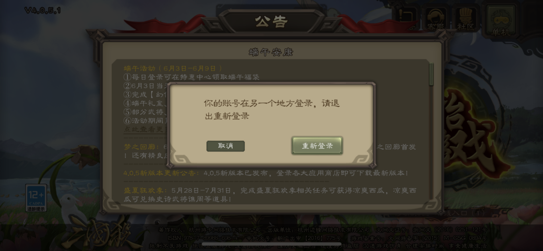 不允许多设备使用的产品,建议直接限制帐号任意时间只能在一台设备上登录使用。在每个设备重新打开时,都实时获取进度,并更新到当前设备,而另一个设备中正在进行的活动被中止,甚至直接设置为不允许同一帐号同时在多台设备上登录使用。如三国杀: