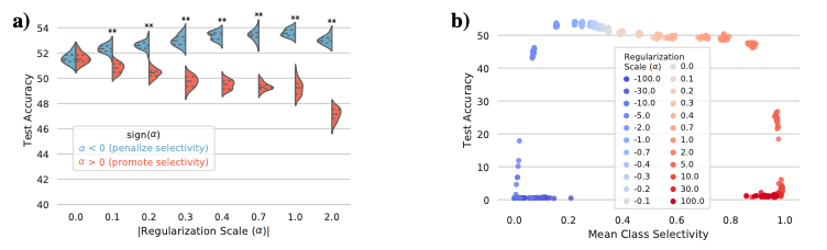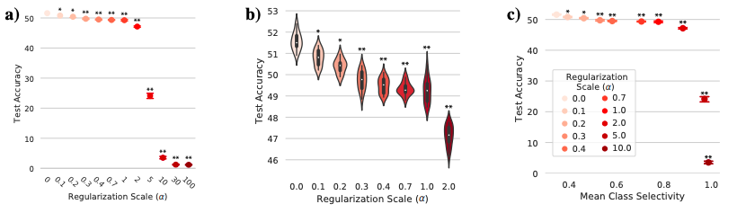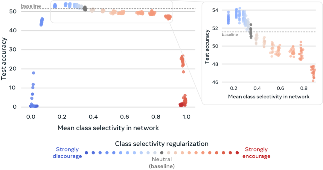 每个点代表一个 DNN。点的颜色代表了 DNN 神经元中「类选择性」被使用或禁止的程度。X 轴显示 DNN 神经元之间的平均类选择性,Y 轴显示 DNN 对图像分类的准确程度。