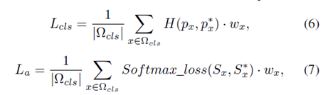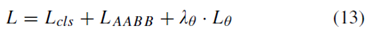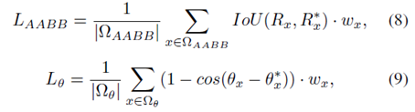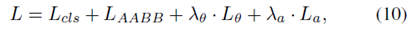 这里,损失函数参考了FOTS [7],额外增加了La来对每个锚点进行分配。损失函数如公式6到10所示,Lcls,La,LAABB,Lθ分别为分类损失,锚点分配损失,回归框损失和角度的损失函数。L为最终的损失函数,其中