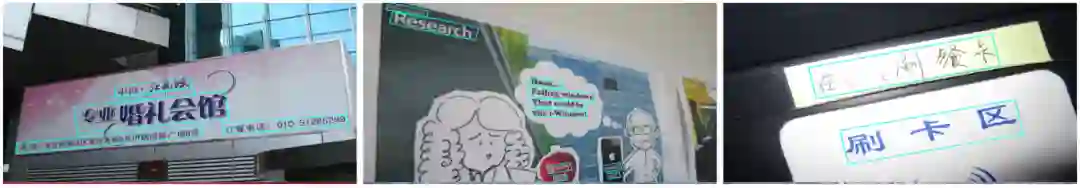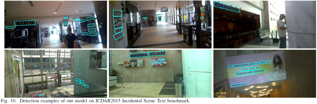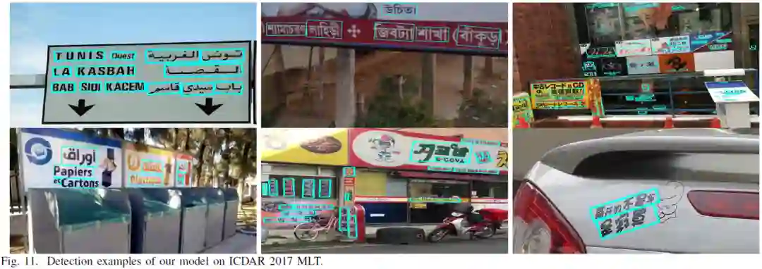 上图展示了一些可视化的场景文本数据集MSRA-TD500, ICDAR 2015和ICDAR 2017 MLT的检测结果图。