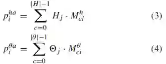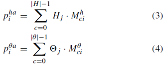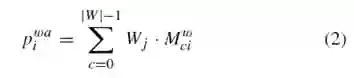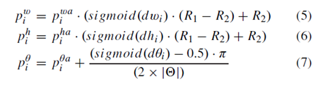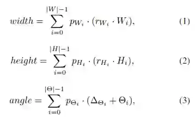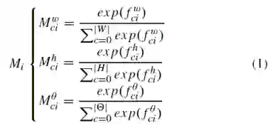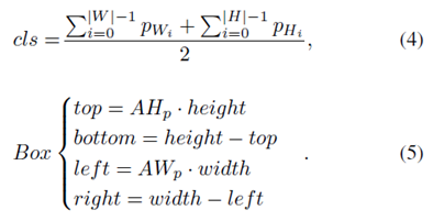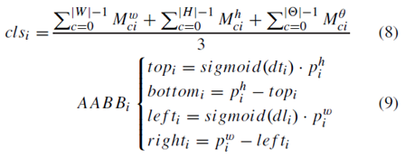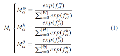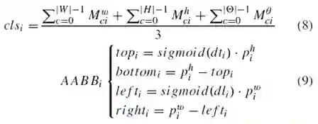 预测的注意力机制权重如公式1所示;注意力机制之后预测出来的锚点值为公式2、3、4;预测的宽、高、角度值为公式5、6、7;最终的预测分类结果为公式8,回归框为公式9。