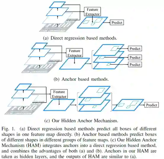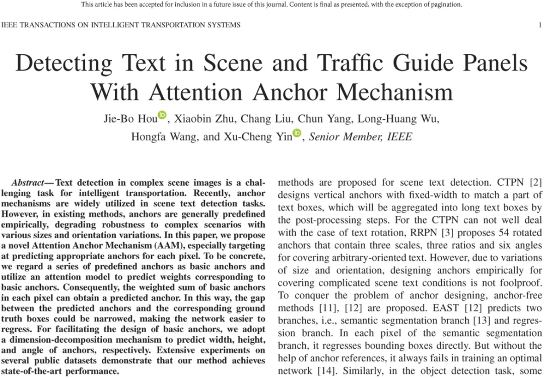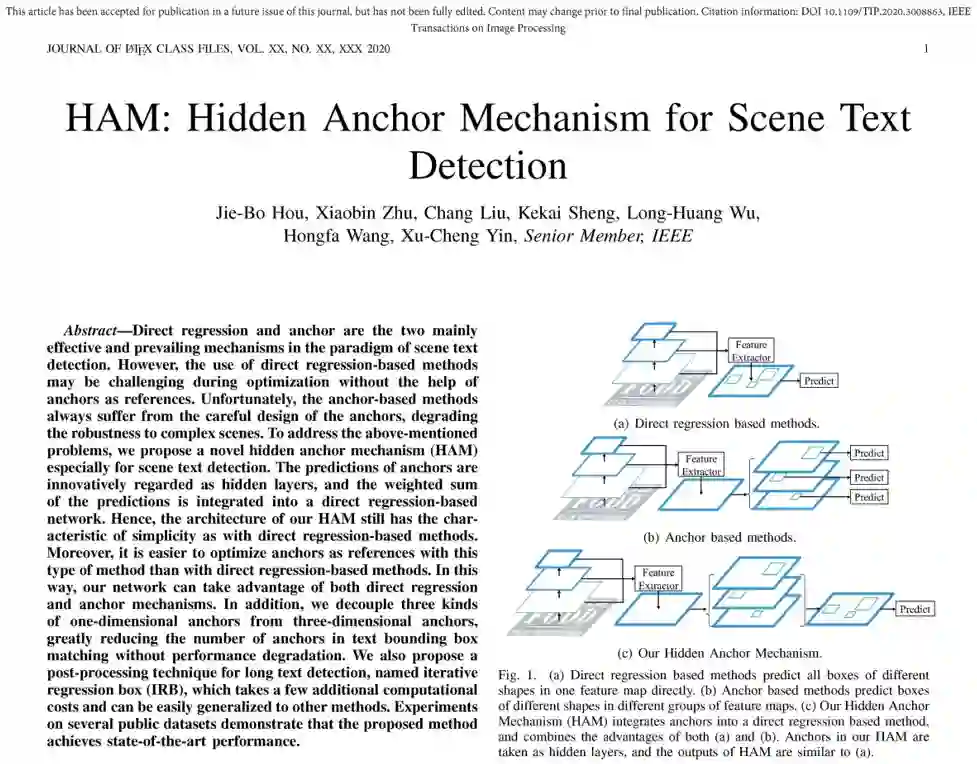 在自然场景文本检测技术中,基于锚点的回归方法是其中的一种主流方法[1,2,3,4]。然而,由于场景文本的多方向分布及尺寸角度变化的多样性,这类方法常常需要设计复杂多样的锚点来匹配各式各样的文本;场景文本检测中的锚点机制需要深入的探索,并进行有效的改进与创新。本文主要介绍两篇对于文本检测中锚点机制进行改进创新的论文:隐式锚点机制 HAM(IEEE TIP2020: HAM: Hidden Anchor Mechanism for Scene Text Detection)和注意力锚点机制 AAM(IEEE T-ITS 2020: Detecting Text in Scene and Traffic Guide Panels With Attention Anchor Mechanism)。