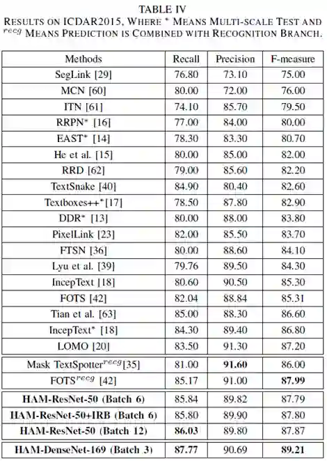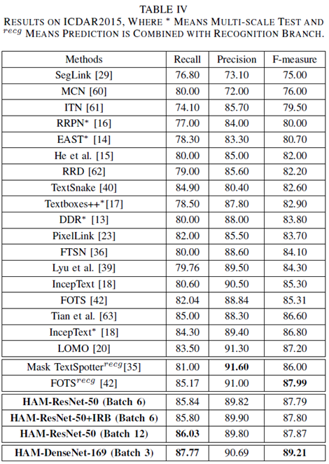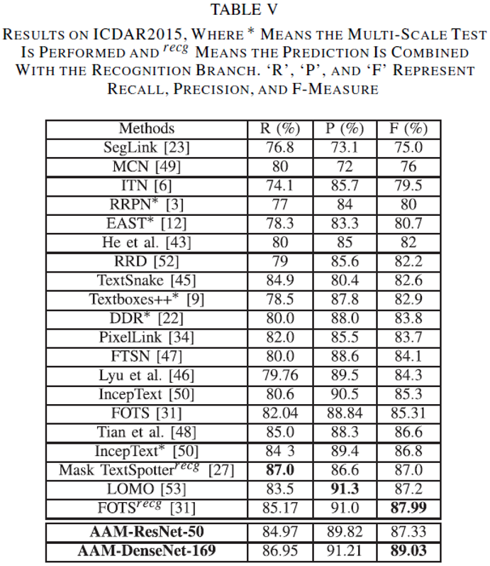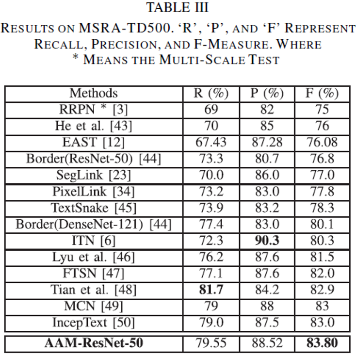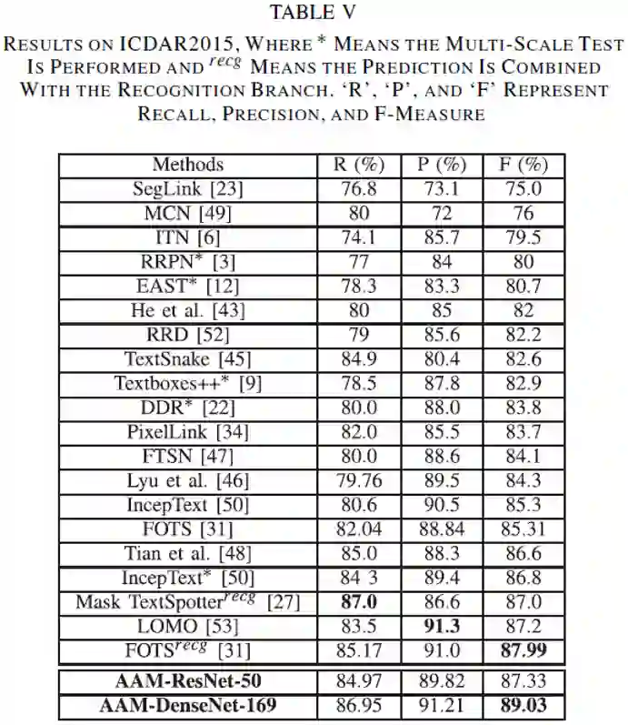 从表III和V可以看出,该方法在MSRA-TD500和ICDAR 2015上都取得了State-of-the-art的检测效果。