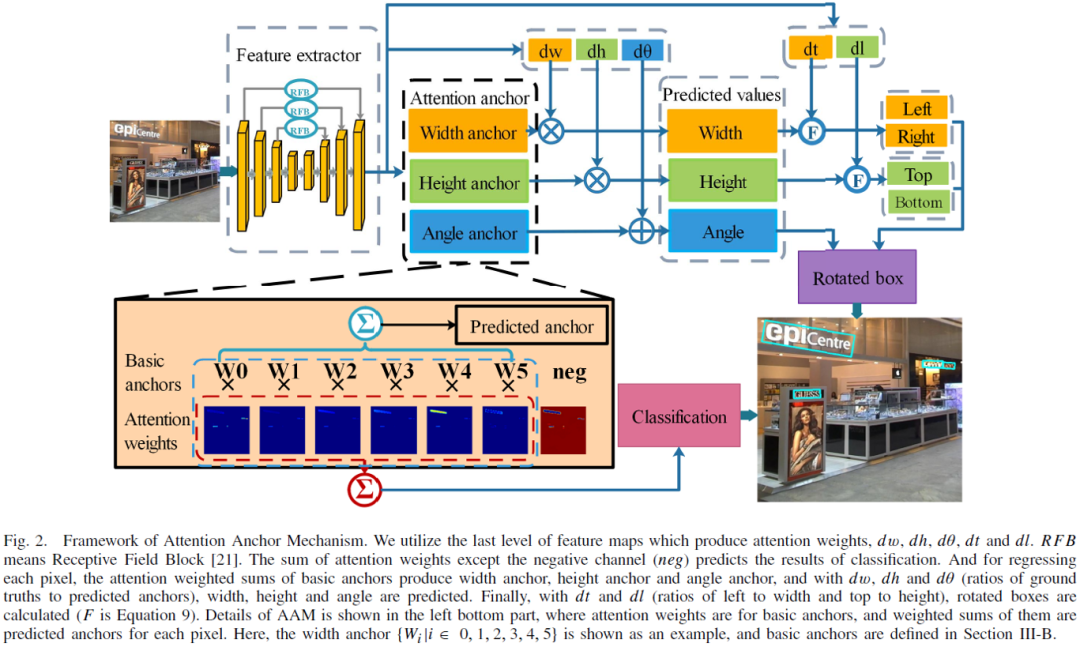 注意力锚点机制的原理如图2所示,主干网络类似于FPN,其中添加了RFB模块来增强网络的感受野。论文对于解耦合之后的锚点使用了注意力机制,将注意力机制预测的权重作为每个锚点的权重,并将每个维度的锚点进行加权求和,从而预测出一个适合当前文本的锚点,即为注意力锚点。在注意力锚点的基础上,本文的方法预测了文本的真值和锚点的比例,从而预测出文本的宽度,高度以及角度。