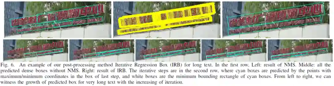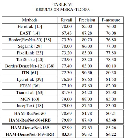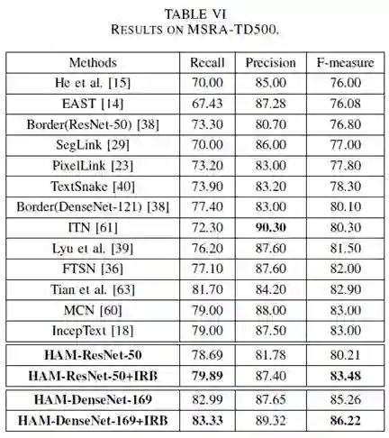 从表VI和IV可以看出,该方法在MSRA-TD500和ICDAR 2015上都取得了State-of-the-art的检测效果。其中+IRB代表使用了本文提出的迭代回归框的后处理方法,