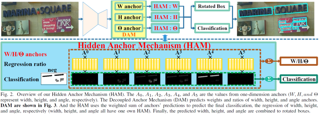 这两篇论文首先将锚点进行长度、高度、角度的解耦合[5],然后采用不同的改进方法将锚点重构为最终的文本检测结果,能够克服锚点设计的复杂性,自适应的检测不同方向、不同尺度的场景文本。其中,隐式锚点机制 HAM将所有锚点的预测值当做一个隐藏层,然后将所有的预测结果融合,使得网络的输出类似于直接回归方法。注意力锚点机制 AAM使用注意力机制预测宽度、高度和角度锚点,然后根据预测出来的锚点来进行最终检测文本的回归。