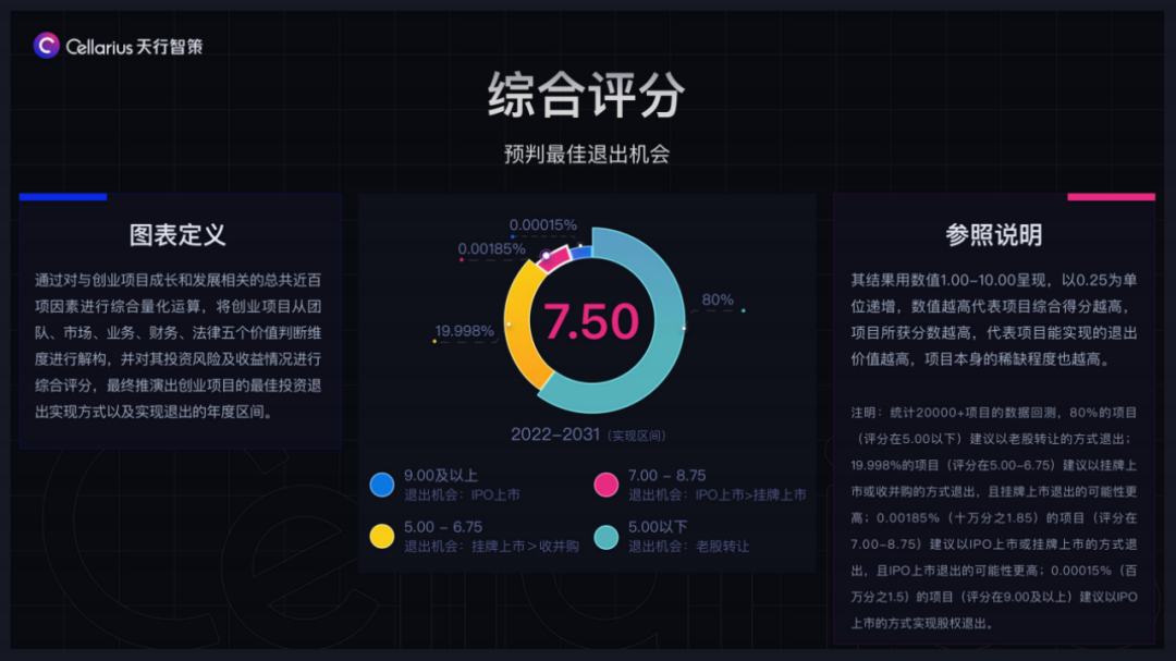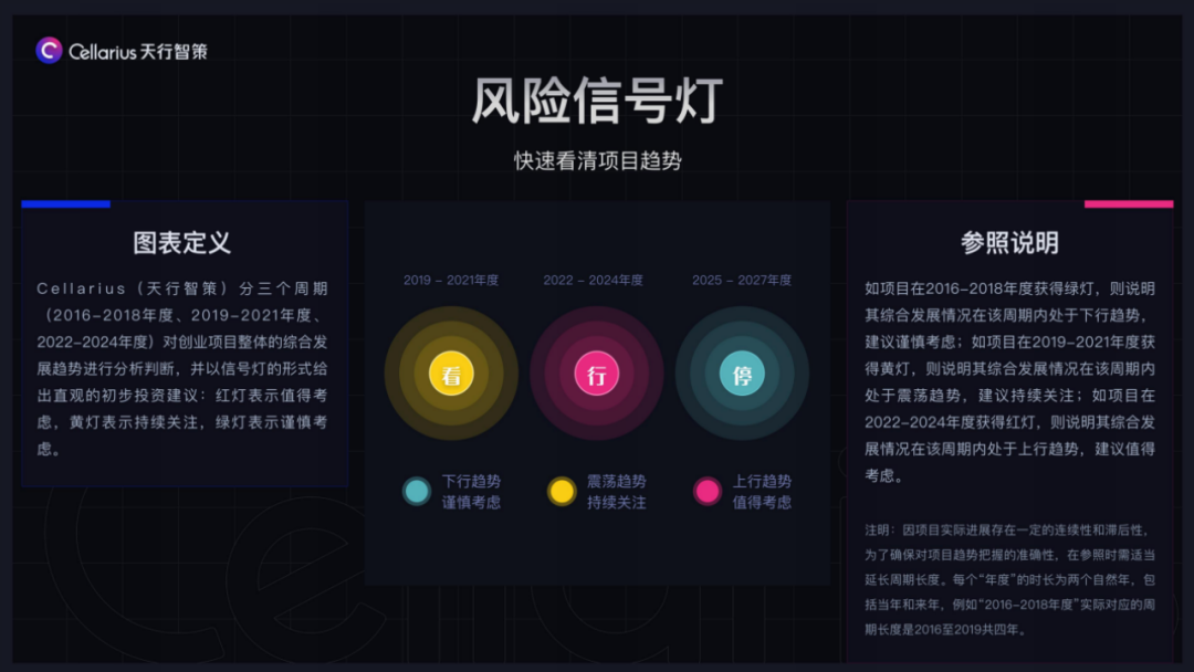 赖润伟:是的。“天行算法”实际包含了七大板块,风险信号灯、团队能效、市场规模、业务发展趋势、融资营收趋势、法律安全趋势,当数据录入之后,系统最终会给到一个综合评分。