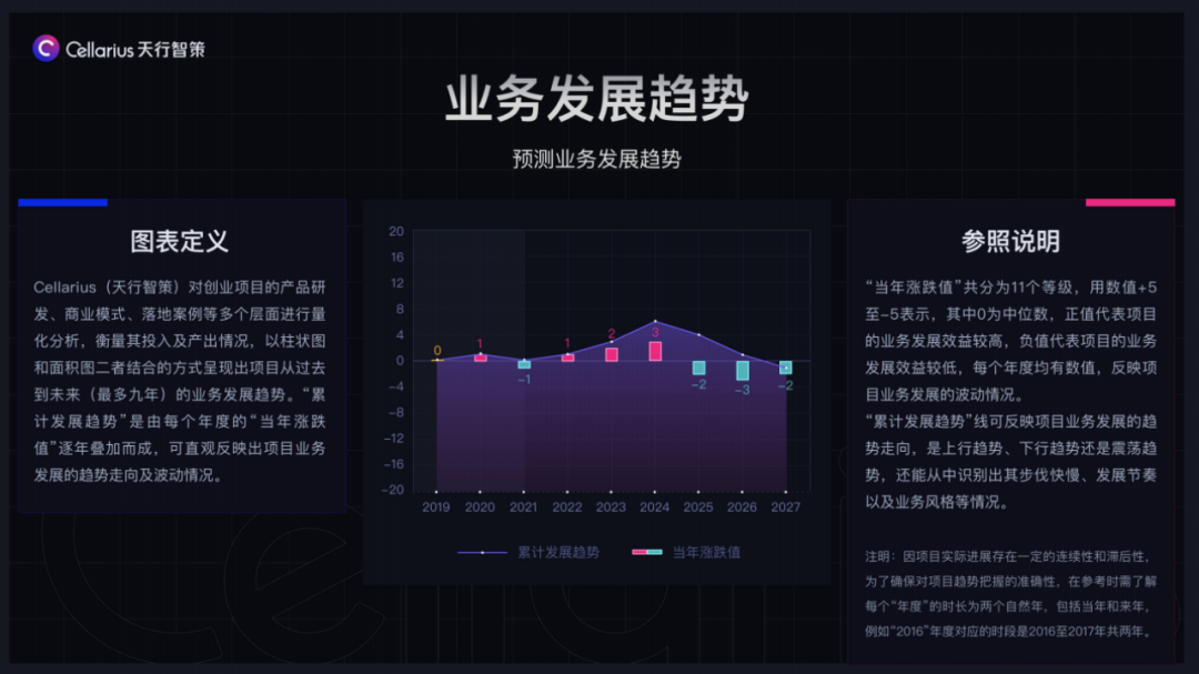 通过算法系统,我们能够复盘及预判出项目发展趋势是处于上行、震荡还是下行,以此快速判断出投资风险是大还是小;该项目在过去及未来的高低起伏也是一目了然的,不仅能够识别出发展的高峰和低谷,而且还能够将业务、融资和营收的情况按照每个年度区分呈现(示意图2)。