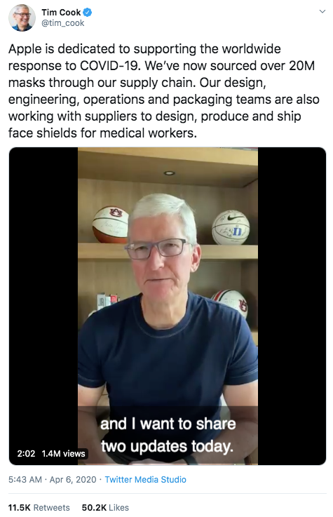 昨天,苹果CEO库克在Twitter上分享了一段视频,介绍苹果应对新冠病毒最新的两个举措,同时亮出了苹果的最新产品: