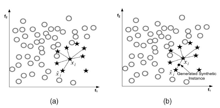 SMOTE(Synthetic Minority Oversampling Technique),合成少数类过采样技术.它是基于随机过采样算法的一种改进方案,由于随机过采样采取简单复制样本的策略来增加少数类样本,这样容易产生模型过拟合的问题,即使得模型学习到的信息过于特别(Specific)而不够泛化(General),SMOTE算法的基本思想是对少数类样本进行分析并根据少数类样本人工合成新样本添加到数据集中,具体如下图所示,算法流程如下。