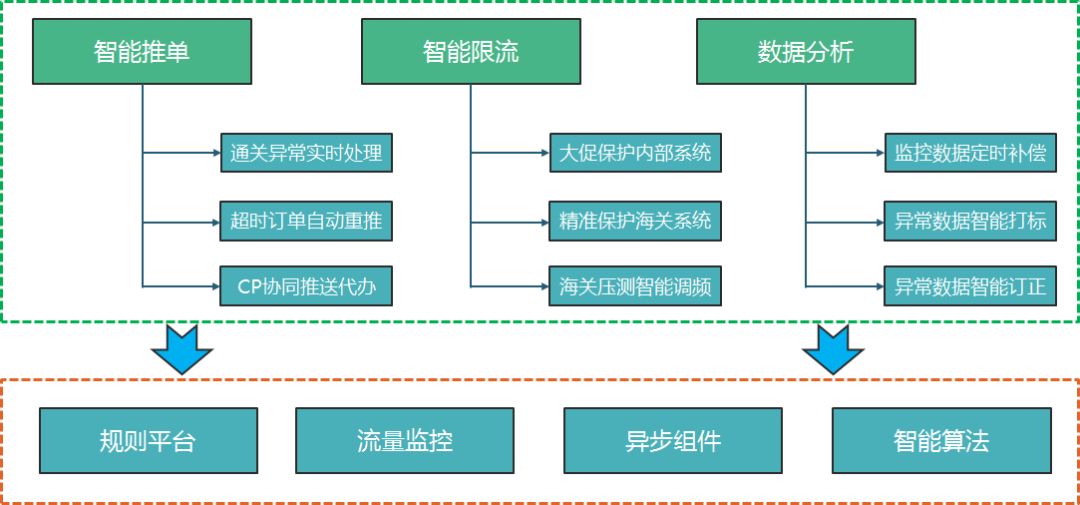 今年是关务的智能化元年,在正向申报链路上,我们推出了智能限流与智能hold单产品,自适应保护自身与海关系统。在人工成本降低的同时,保证了海关系统的最大吞吐能力。在异常处理上,我们基于规则引擎上线了异常智能处理系统,通过不断丰富异常处理规则,系统变得越来越聪明,基本上可以自动处理大部分海关异常。同时,作为关务智能大脑,还为关务数据中心提供数据分析服务。智能系统包含产品如下: