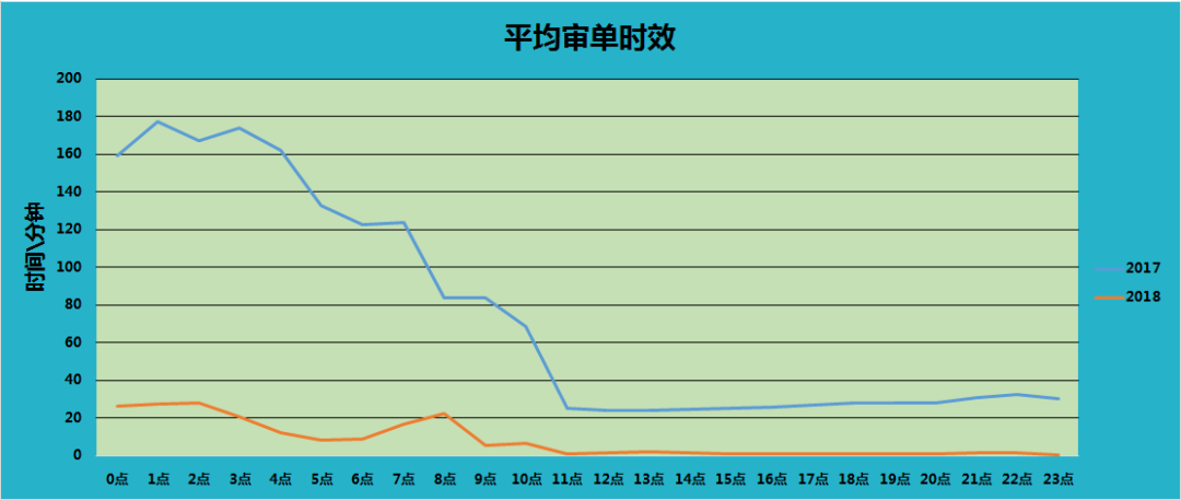 这次微小的调整,却带来了巨大的性能提升,在今年双十一大促上,批量申报也是大放异彩,整个通关审单时效大大降低,申报能力相比往年也有质的提升。如下是17年和18年双十一某一属地海关的平均审单时效对比,相比17年,今年的平均审单时效非常稳定,基本保持在20分钟以内,海关上行和下行通道毫无压力。