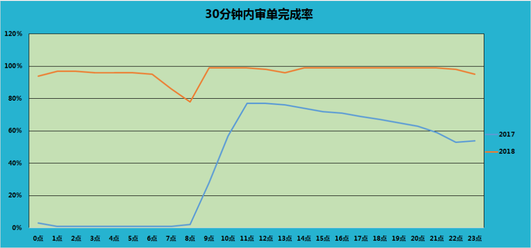 如下是某海关30分钟内审单完成率情况,相比往年,今年审单能力有巨大的飞跃,基本上是零堆积,申报速度跟审单速度几乎持平。