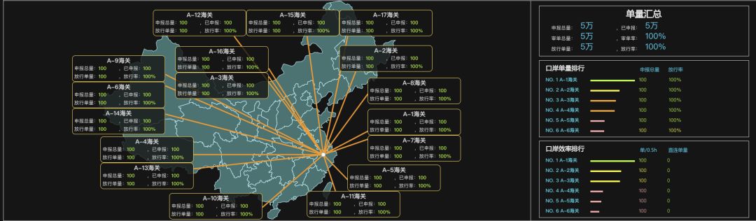 整个通关链路长,依赖系统多,如果有一个全链路的监控系统进行护卫,不仅可以实时窥视整个链路流转情况,还可以做到异常的实时跟踪处理。为此,我们搭建了关务数据中心,承载关务所有数据,并依托它构建了整个星宫大盘产品,将业务监控,指标监控,系统监控一体化,真正实现360度无死角主动监控。如下图(注:下图中数据非真实数据,仅做示例):