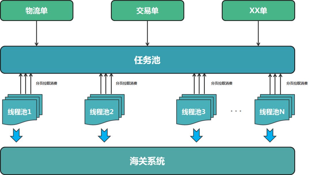 批量申报调度模块自研了一个轻量的批量调度框架实现,通过一个任务池汇总所有任务,按照不同业务规则聚合同类型的任务然后进行消费。如下: