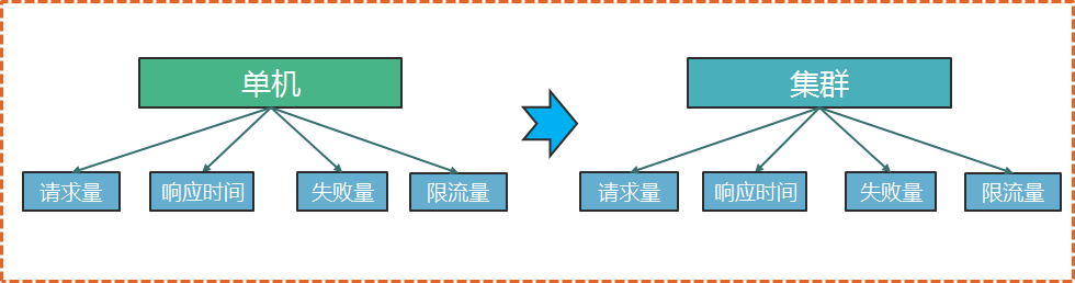 单机指标监控主要是做单机限流,单机限流的最大好处是能够保障单台机器不会被上游压垮。而对下游而言,单机限流可用性较低,对集群数据来说准确性不能保障。