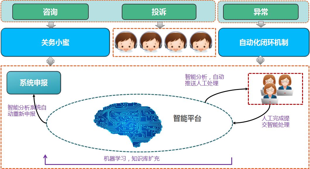 然而,经过不断的实践证明,短期单纯依赖系统自动处理所有的异常是不现实的,有部分还是需要人工介入(比如备案问题),然后再利用系统进行重新申报。因此,异常智能处理系统的目标是:搭建人机交互闭环机制,沉淀底层知识大脑,快速提高异常处理的智能化程度。
