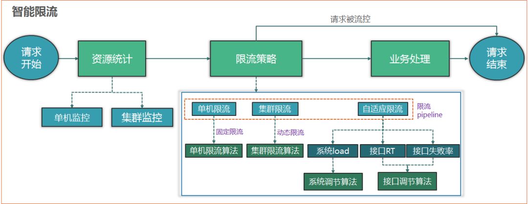 智能限流分三个主要模块:资源监控(对资源的请求量精准统计)、限流策略(请求量达到阈值后的操作)、智能调控(依据一定的规则与算法调节)。