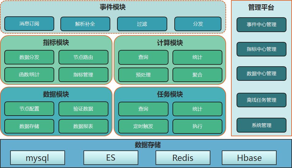 数据中心涵盖了整个关务生态的数据,通过实时+离线两种方式,很好的支撑了实时业务监控和指标监控等核心业务。如下是整个数据中心核心架构,包含消息接入,指标计算,数据存储等核心模块。