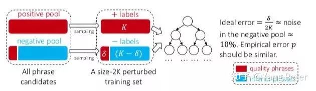 构建多组基本的分类器,分别从Positive Pool和Negative Pool中随机抽取出K个candidates全部,而在负样本中存在perturbed training set见图中的δ,为了尽可能低的降低训练误差的基础分类器,构建一颗未进行剪枝的决策树的方式,当在perturbed training set中没有两个positive和negative phrase共享相同的特征值时,我们认为此时的决策树可以达到100%的训练准确率。最后通过ranking的方式输出排序的结果。