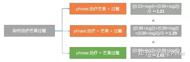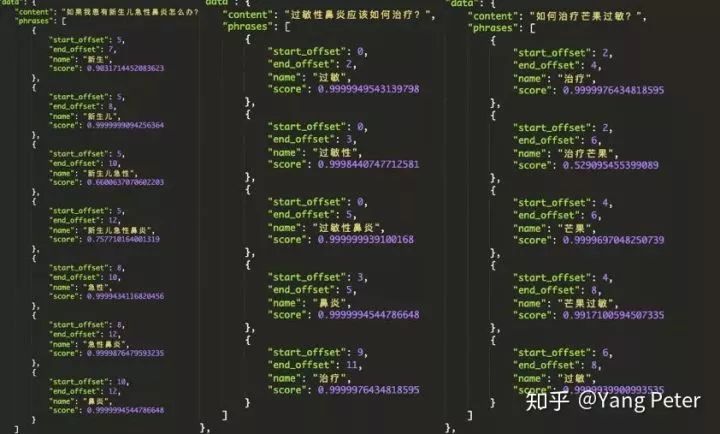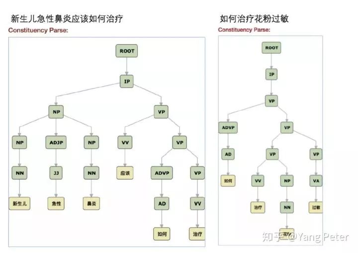 其中新生儿急性鼻炎是一个名词短语(NP),是由NN + JJ + NN组成的,因此传统的方式是根据POS规则模版[3]对phrase进行提取,但是实际操作中存在一些问题,如果直接使用corenlp的浅层句法分析的结果并不是很好,比方说"如何治疗花粉过敏"这句话中的Phrase应该是花粉过敏,但是治疗和花粉合并成了动词短语。但是如果要穷尽所有的POS pattern,并不是一件容易的事情,而且pattern之间可能会存在一些冲突,于是pattern之间排序又成了另一个坑。