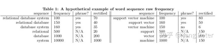 原始计算频率时,并没有考虑真正分词的结果,只是统计词出现的频率,例如support vector machine出现了在预料中出现了100次,但是根据分词结果进行修正(rectified)后,其只出现了80次,同样的vector machine修正后只出现了6次。那么vector machine不算是一个phrase。