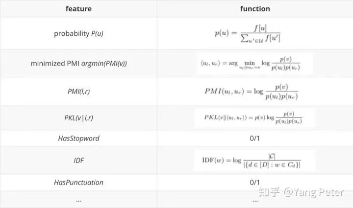 于是接下来的工作中,根据频繁短语监测生成短语候选集,再根据人工筛选出的高质量的短语使用RandomForest构建分类器模型,实验中发现选择200-300个数据就可以满足分类结果。其中特征选取如下表所示:
