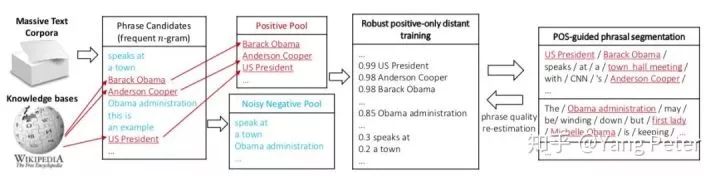 如上图所示,根据frequent n-gram抽取phrase Candidates根据远程监督的方式,根据wikipedia进行过滤筛选出Positive Pool和Noisy Negative Pool,对于Positive Pool来说,其信源比较准确,于是Positive Pool的抽取结果肯定是置信度极高的,而Negative Pool是存在噪音的,因为可能有一些Phrase不存在WikiPedia中,因此文中提到用一种集成学习的方式降低噪音。