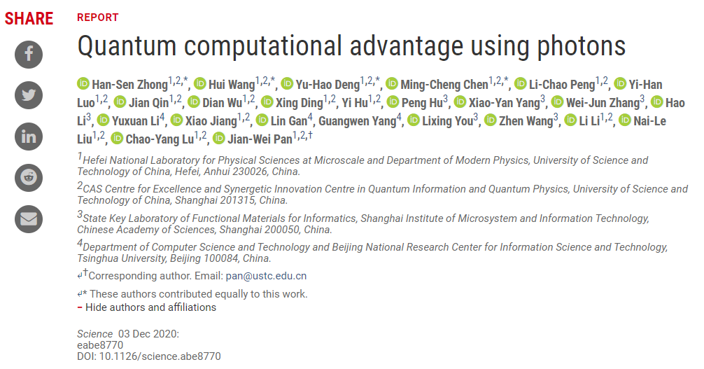 近日,中国科学技术大学潘建伟研究团队与中科院上海微系统所、国家并行计算机工程技术研究中心合作,成功构建了 76 个光子 100 个模式的高斯玻色取样量子计算原型机「九章」,其处理特定问题的速度比目前最快的超级计算机「富岳」快了一百万亿倍,同时也等效地比谷歌去年发布的 53 比特量子计算原型机「Sycamore」快一百亿倍。
