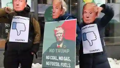 @凤凰财经【特朗普刚抵达沃斯,没想到人们以这样的方式“迎接”他】昨日(1 月 25 日)特朗普终于抵达达沃斯来凑热闹了。但是比较尴尬的是,特朗普反对者在达沃斯小镇街头头戴特朗普面具,并做出“鄙视”动作,嘴里高喊:“Trump not welcome(不欢迎特朗普)”!一位女性示威者表示,“我来自德国,现在全球气候已经出现变化,但特朗普却漠视这个现象,我们不欢迎这样一个种族主义者、抵制巴黎协定的人来到达沃斯。