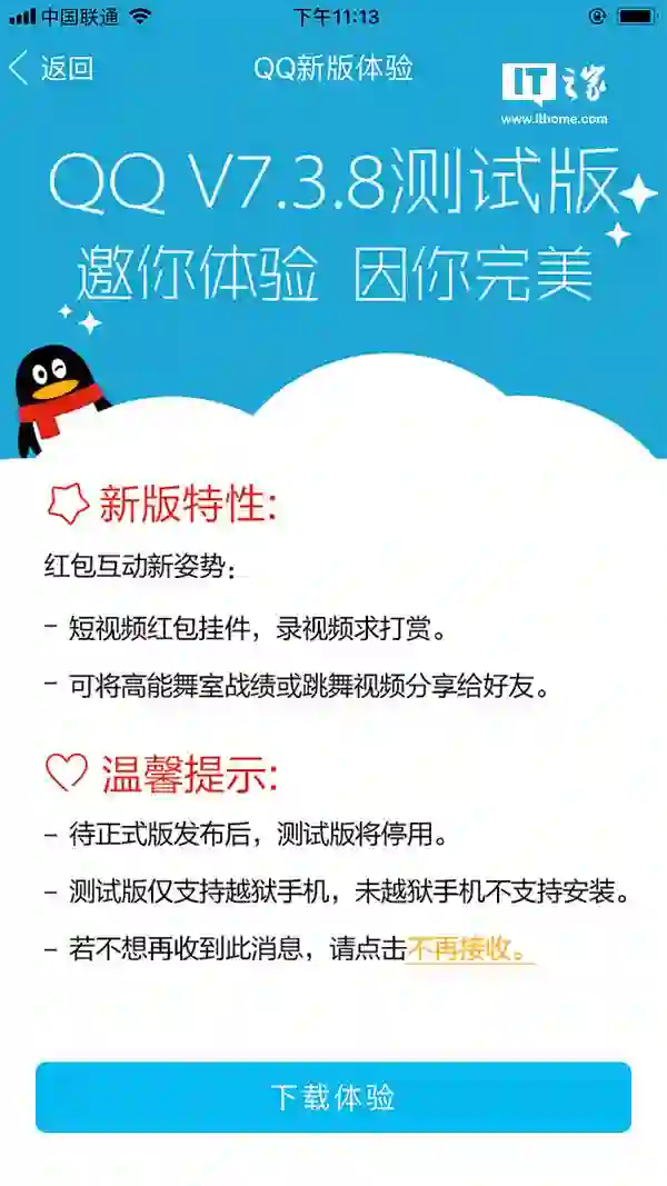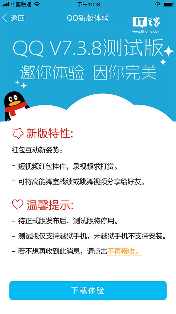 @IT之家【手机QQ iOS版v7.3.8测试版更新:一起来尬舞】昨日晚间消息,手机QQ iOS版v7.3.8测试版正式面向用户开放下载。本次更新依旧是主要新增与红包相关的功能,看来随着春节的临近,腾讯决心要让大家愉快地玩一波红包功能了。此次的测试版本面向越狱系统用户,普通用户或者Testflight用户无法下载使用。