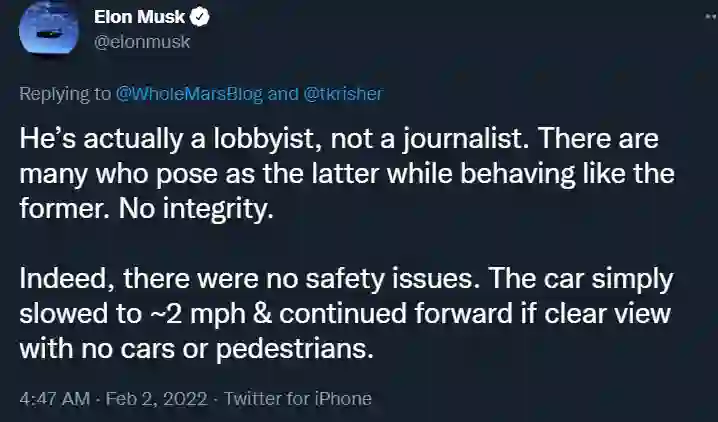 特斯拉首席执行官埃隆 · 马斯克在推特上表示,该功能「不存在安全问题」。马斯克写道:「汽车只是减速到大约 2 英里(3.2 公里)/ 小时,如果视野清晰,没有汽车或行人,就继续向前行驶。」