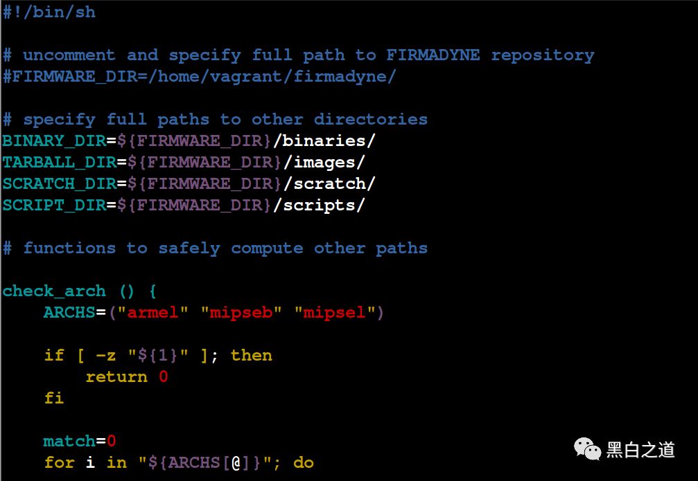 找到 FIRMWARE_DIR=/home/vagrant/firmadyne/这一行,然后修改Fireadyne的地址为当前的全路径,我这里修改完之后是这样的: