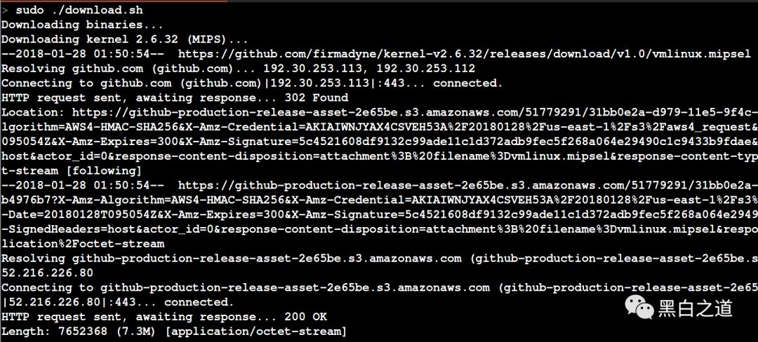 修改完之后,下一步就可以下载Firmadyne需要的其他文件了,如果网络状态好的话,这个过程需要1-2分钟,这时候我们可以河北咖啡或者吸根烟了。