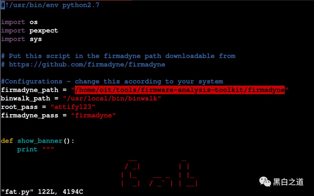 然后打开fit.py,修改root的密码(当运行这个脚本的时候就不会再需要输入密码了)和指定firmadyne的目录,例如: