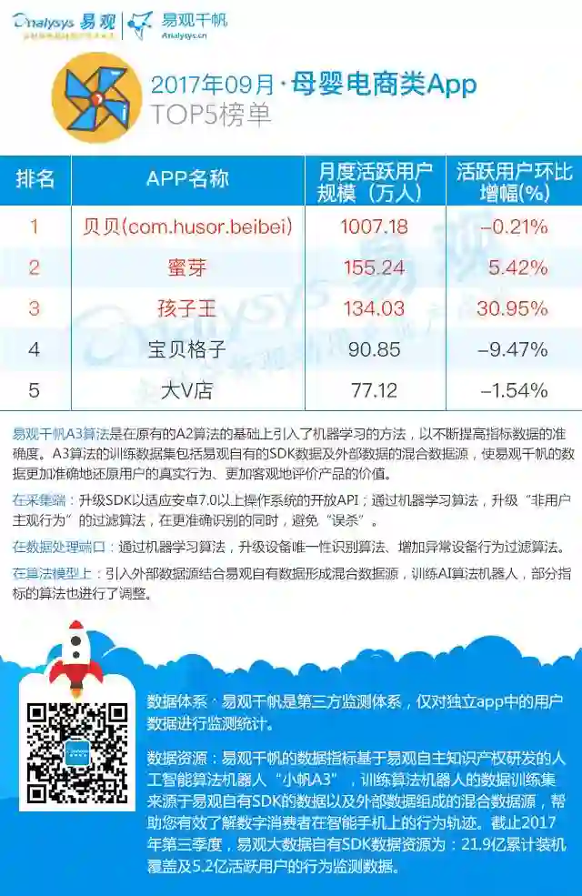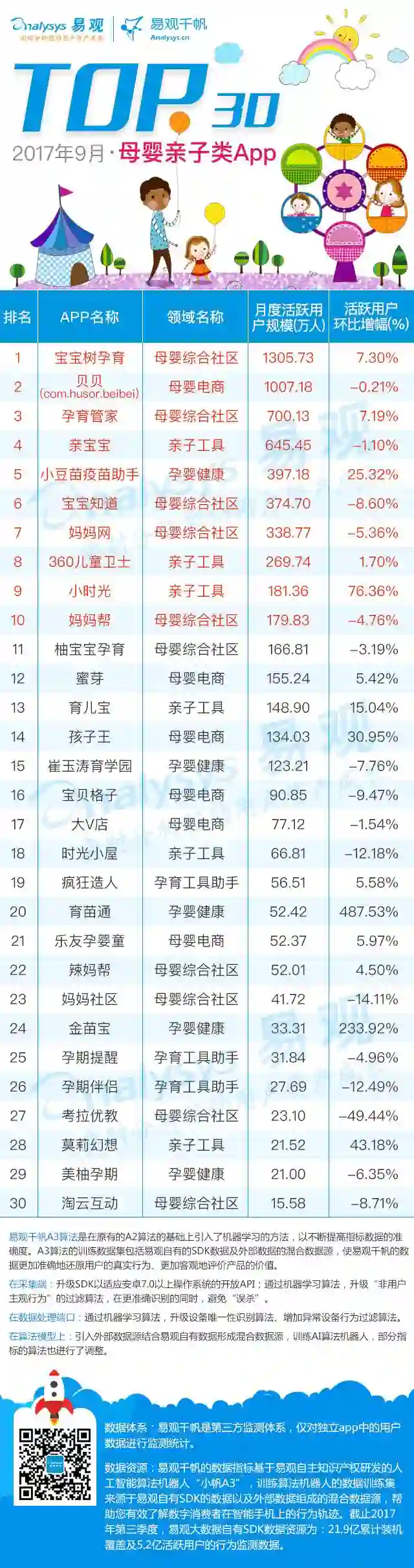 基于易观千帆9月移动应用大数据,我们从母婴类App中,选取母婴电商、母婴综合社区、亲子工具等三大领域的运营数据独家发布,根据月度活跃用户规模来编制排行榜单和分析解读。