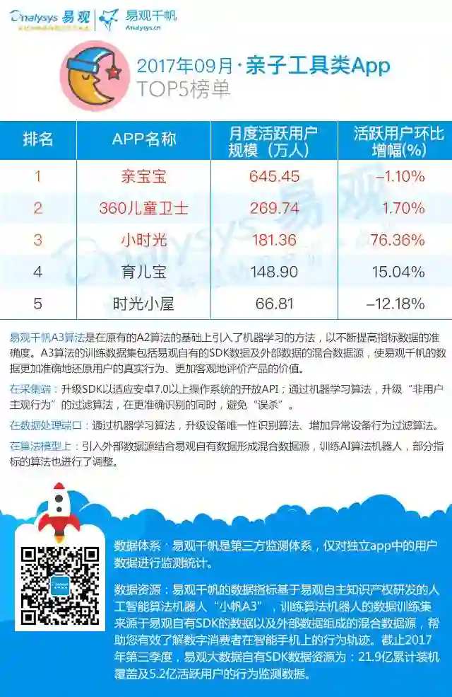 亲子工具领域,亲宝宝月活跃用户达645.45万。在第二方阵,除小时光外,育儿宝月活跃用户环比增幅达15.04%。