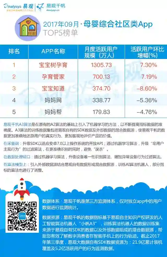 宝宝树孕育持续领跑母婴综合社区,月活跃用户超过1300万,而孕育管家也不甘落后,月活跃用户环比增幅达7.19%。