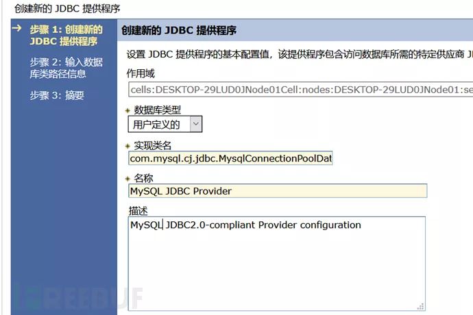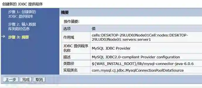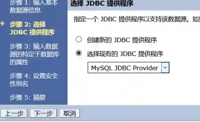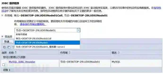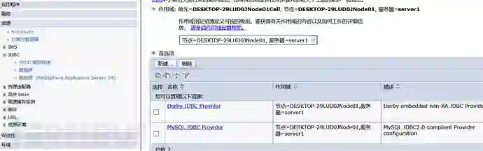 2)登录控制台,首先先配置资源中JDBC的JDBC提供程序,新建一个JDBC提供程序。作用域可任选,不过不能是全部,毕竟全部并不是一个选项,会提示错误。